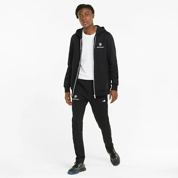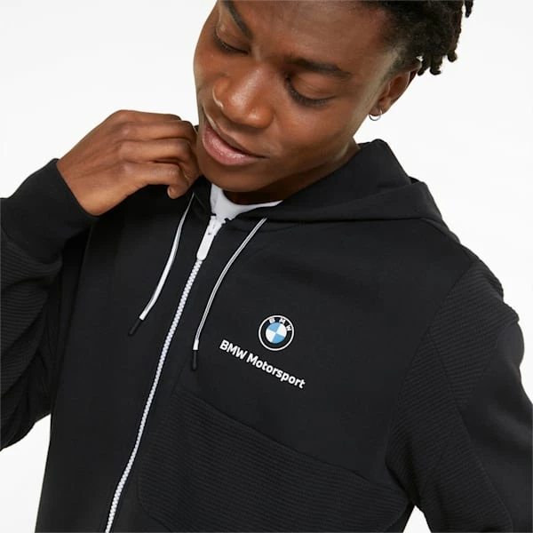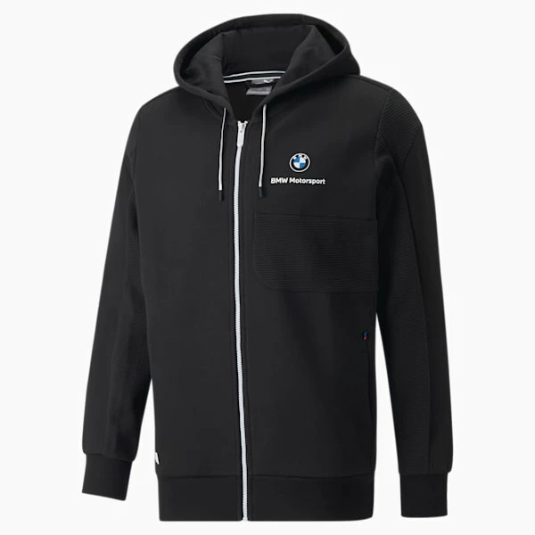 Celebrate the timeless luxury and unparalleled performance of BMW M Motorsport with intricate details and iconic branding that speak to a lineage of excellence in this partner collection. Our BMW M Motorsport Hooded Sweat Jacket features iconic BMW M Motorsport accents, a cozy fabrication and recycled materials for the eco-friendly thrill-seeker with a passion for precision motors.<h3>FEATURES & BENEFITS</h3><ul><li>Contains Recycled Material: Made with recycled fibers. One of PUMA’s answers to reduce our environmental impact.</li></ul><h3>DETAILS</h3><ul><li>Hooded neckline</li><li>Multi-pocket feature at chest and direct entry front pockets</li><li>Asymmetrical front design</li><li>Angular panels and seaming</li><li>BMW M Motorsport branding</li></ul>