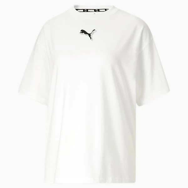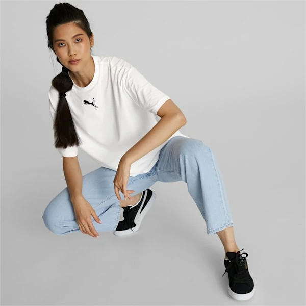 To illustrate Breanna Stewart’s “Quiet Fire” versatility, the back of the Stewie Graphic Tee features an artistic black and white photo of a weathered hardwood court overlapping a smoky flame image. The latter resembles the basketball star mid-play, while the clean front—with its minimalist PUMA cat logo—offers a streamlined look.