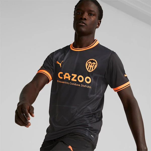 <h3> PRODUCT STORY </h3><p>Mestalla forever. Celebrating 100 years of the Mestalla Stadium, the 2022/23 Valencia CFAway jersey sports a black base with orange accents and a tonal repeat graphic drawn from the “Camp de Mestalla 1923-2023” centenary logo. Amunt Valencia!</p><h3> FEATURES & BENEFITS </h3><ul><li>dryCELL: Performance technology designed to wick moisture from the body and keep you free of sweat during exercise</li><li>Recycled Content: Made with at least 20% recycled material as a step toward a better future</li><li>Midori: Made with the bio-based finishing treatment miDori® bioWick</li></ul><h3> DETAILS </h3><ul><li>Regular fit</li><li>Set-in sleeve construction with raglan back seam</li><li>Crewneck</li><li>PUMA Cat Logo on the chest and sleeves</li><li>Official team crest on the chest</li></ul>