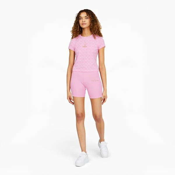 Live out your high-octane, high energy, high-gloss dreams in PUMA x BABY PHAT. Inspired by the fast-paced neon under-glow of the aughties street scene, this collection shines a spotlight on the PUMA woman and puts her right in the driver’s seat. Iconic silhouettes get a boldly feminine twist, imbued with all the confidence and power of the early-2000’s It Girl. Bright pops of pink, touches of gold, and shimmering accents bring out the best of both cats in one, innovative collection. This version of the Fierce Fitted Tee features an eye-catching all-over print with a gold logo at the sleeve that really shines under headlights.